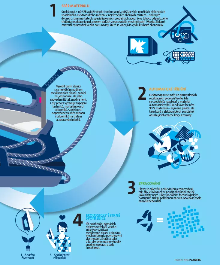 Všechno začíná sběrem odpadu. Ve Francii jsou podle platné legislativy všichni výrobci povinni postarat se o likvidaci svých produktů. Těžko však lze čekat, že budou staré spotřebiče sami přebírat od soukromých uživatelů – místo nich tuto funkci plní státem pověřená společnost, jíž za sběr odpadu platí. „Tato společnost se snaží získávat zpět co největší objem odpadu, který je pak zpracováván v recyklačních jednotkách,“ říká Françoise Weberová, referentka Veolie pro rozšířenou odpovědnost výrobců v rámci divize Recyklace a zhodnocování odpadů. „Recyklační procesy jsou dnes již plně integrovány do průmyslové výroby.“ Po vytřídění se plasty zpracovávají tak, aby jejich kvalita odpovídala požadavkům výrobců. V závislosti na ceně ropy je recyklovaný plast někdy levnější, ale někdy také dražší než nově vyrobená surovina. Jak zdůrazňuje Françoise Weberová, „nelze připustit, aby se ekonomický model zhroutil při každém poklesu cen ropy. Je proto třeba zaměřit se na celý hodnotový řetězec, aby byla zaručena udržitelnost celého systému.“