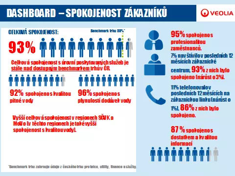 Celková spokojenost zákazníků se službami, které vodárenské společnosti nabízejí, dosáhla úrovně 93 %, což je nad hodnotou dlouhodobého průměru trhu podobných segmentů (89 %). Průzkum potvrdil, že na celkovou spokojenost všech zákazníků má největší vliv kvalita pitné vody a plynulost dodávek. Spokojenost s kvalitou vody se zvýšila z 91 na 92 %. Nejvyšší spokojenost projevili respondenti v severočeském kraji a na Moravě – zákazníci Moravské vodárenské.
