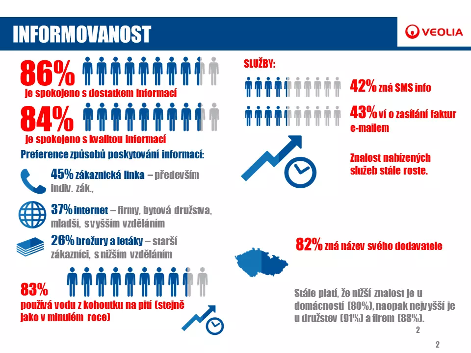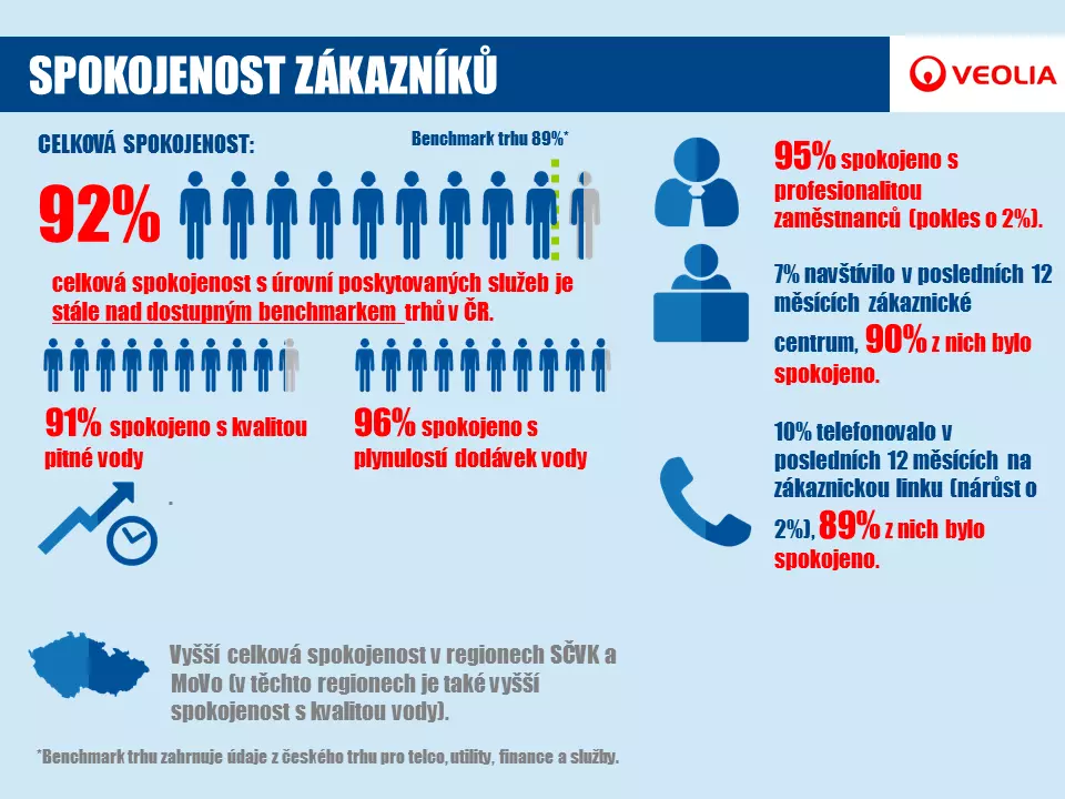 95 % respondentů, kteří přišli do kontaktu se zaměstnanci vodárenských společností ze skupiny Veolia, je s jejich profesionalitou spokojeno. S profesionalitou zaměstnanců je zaznamenána vyšší spokojenost především u mladších respondentů (98 % respondentů ve věku do 39 let). Spokojenost s prací a chováním odečítače vodoměrů zůstává na nejvyšší úrovni 100 %. Jde o stabilní hodnoty, které se v průzkumu vodárenských společností objevují v posledních letech. Průzkum dále ukázal, že 82 % respondentů zná název svého dodavatele. Nejvyšší je u bytových družstev (91 %) a firem (88 %).